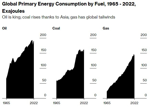 全球对化石燃料的需求也处于历史最高水平,煤炭和天然气的需求都达到了创纪录的水平。去年,化石燃料在全球能源消费中的比重仍保持在 82%。其中,从某种意义上说,石油是2023年化石燃料之王:1965年,石油是消费量最大的化石能源,近70年后的2022年,石油又成为消费量最大的化石能源。