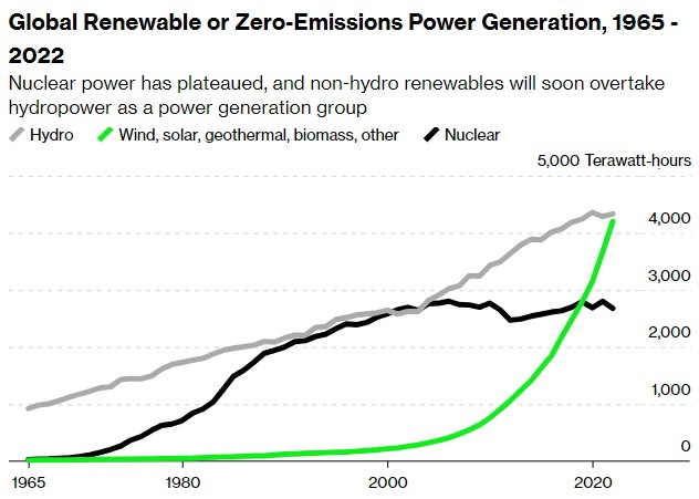 显然,这些数字加起来并不是100%。2001年,风能、太阳能、地热、生物质能和其他零排放发电技术的联合发电占全球零排放电力总量的4.2%。但这些技术(尤其是风能和太阳能)的产能刚刚开始呈指数增长。2020年,非水电可再生能源发电量超过核电,一年后,仅风能和太阳能发电就超过了核能发电。去年,水电发电量为4334太瓦时,而非水电可再生能源发电量为4204太瓦时。