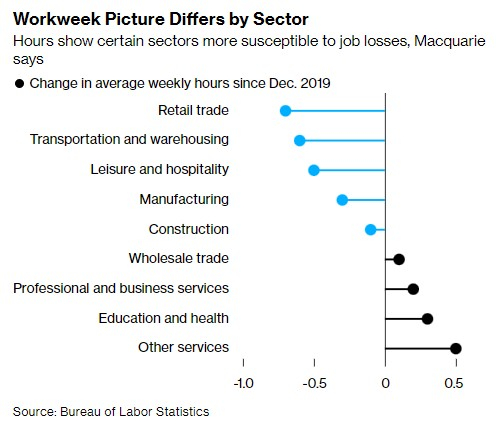 麦格理的经济学家表示,对于零售贸易、运输和仓储以及建筑等行业,工作时间已降至疫情前的水平,这可能会使这些行业特别容易受到失业的影响。