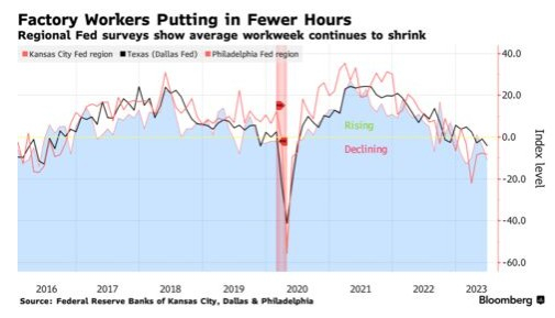 但最近的调查数据显示,制造业的工作时间已经在减少。达拉斯联储6月份的调查显示,6月工厂每周工作时间指标连续第三个月萎缩。不包括疫情爆发的因素,堪萨斯城联储涵盖的制造业指数创下七年多来的第二低。