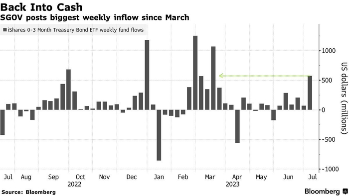 随着人们越来越相信美联储将继续加息,投资者再次涌向拥有更高的确定性和相对较高收益率的现金。汇编数据显示,上周,近5.72亿美元涌入规模达115亿美元的iShares 0-3 Month Treasury Bond ETF(SGOV.US),这是自3月份银行业动荡高峰以来最大的单周流入。与此同时,货币市场基金的资产上周跃升至创纪录水平,结束了连续三周的资金外流。