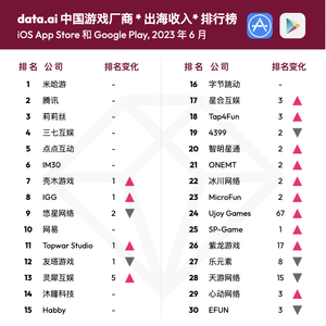 dada.ai7月17日发布2023年6月中国游戏厂商及应用出海收入排行榜,厂商收入榜单前六名依旧稳定。 按排名先后顺序依次是:第一名米哈游、第二名腾讯(00700)、第三名莉莉丝、第四名三七互娱(002555.SZ)、第五名点点互动、第六名IM30。