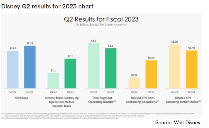 迪士尼第二季度的营收和利润总体上符合市场预期。营收同比增长13%,从上年同期的192亿美元增至218亿美元。调整后每股收益(不包括非经常性项目)下降14%,至0.93美元,未经调整每股收益则从0.26美元攀升至0.69美元。