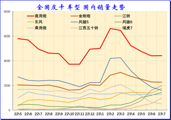 2023年1-7月的总体皮卡销量29.4万,同比下降3%,皮卡的走势相对较平稳。综合近两年走势,皮卡相对于轻卡等走势较好。