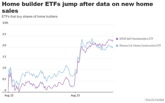 周三的最新数据显示,美国7月份新屋销售攀升幅度超过预期,购买住宅建筑商股票的交易所交易基金震荡走高。