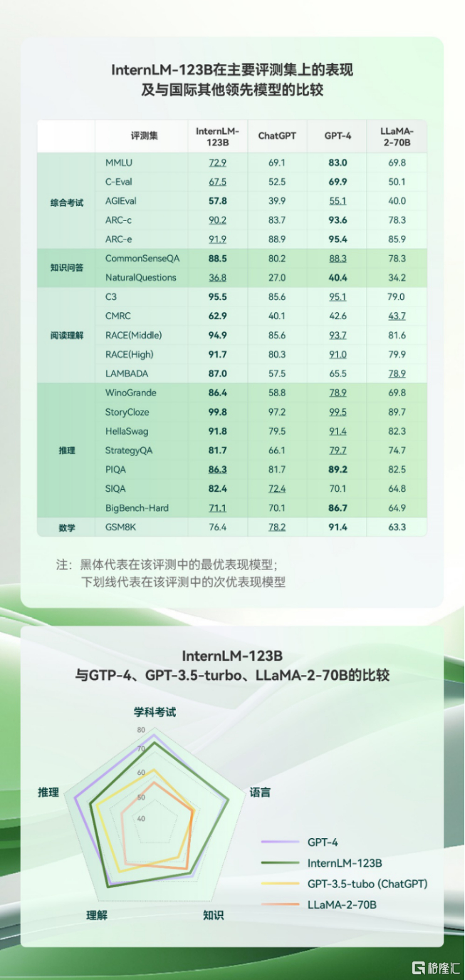 商汤“商量SenseChat”今年4月正式推出,是国内最早的基于千亿参数大语言模型之一,并不断迭代更新。目前,基模型为商汤联合多家国内顶级科研机构发布的书生·浦语InternLM-123B,拥有1230亿参数,在语言、知识、理解、推理和学科五大能力上均处于行业领先水平,并在全球51个知名评测集(包括MMLU, AGIEVAL, ARC, CEval, Race, GSM8K等)共计30万道问题集合上测试成绩整体排名全球第二,超过GPT-3.5-turbo以及Meta新发布的LLaMA2-70B等模型,在主要评测中12项成绩超越GPT-4,排名第一!