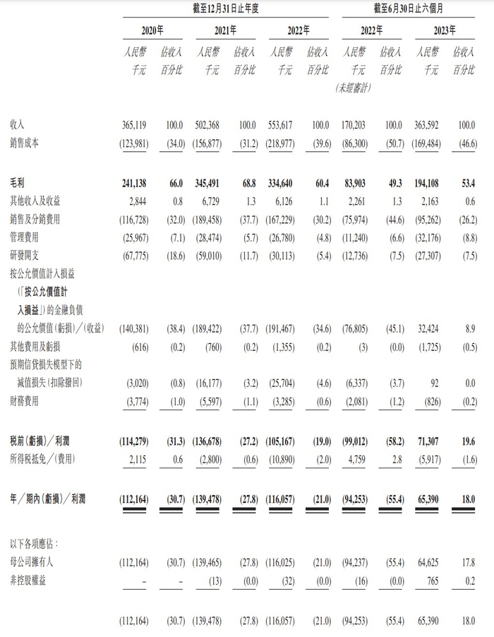 财务方面,于2020年、2021年、2022年截至12月31日止年度以及2022年、2023年截至6月30日止六个月,趣致集团的营业收入分别约为3.65亿元、5.02亿元、5.54亿元以及1.7亿元、3.64亿元人民币,同期净利润分别约为-1.12亿元、-1.39亿元、-1.16亿元以及-9425.3万元、6539万元人民币。
