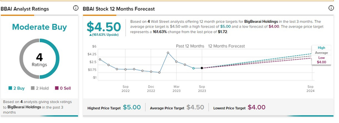 整体来看,华尔街分析师们对BigBear.ai给出了“适度买入”的一致评级(包括2份“买入”评级报告和2份“持有”评级报告),平均目标价则为4.50美元,这意味着该股一年期的潜在上涨空间高达惊人的162%。