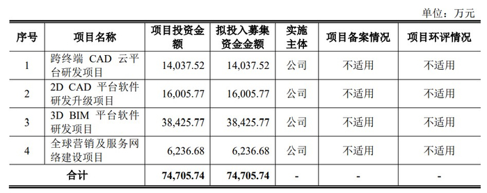 本次发行募集资金扣除发行费用后,浩辰软件将投资于以下项目: