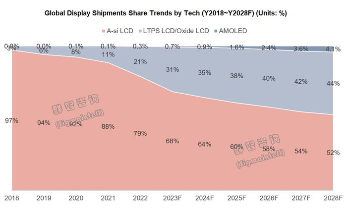 从车载显示产品技术规格发展趋势来看,车载显示屏向高分辨率,大尺寸化、窄边框、触控集成等的方向发展比较明确。终端用户对LTPS LCD面板需求的持续增加,根据群智咨询(Sigmaintell)最新数据,预计2023年全球LTPS LCD车载显示面板出货量约5600万片,渗透率提升超30%。