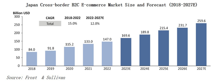 弗若斯特沙利文表示,随着电子商务的进一步普及和新一代年轻消费者对网上购物的日益依赖,日本国民购买力水平的提升以及对优质产品的需求将进一步促进电子商务的蓬勃发展,其预计从2022至2027年,日本跨境B2C电子商务市场的规模(按GMV计算)将从1470亿美元增至2596亿美元,年复合增速12%。