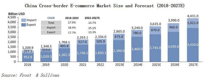 而在国内市场中,跨境电商赛道亦保持着快速成长。得益于国内电子商务产业的繁荣发达,我国在跨境电商领域的发展有明显优势,随着我国出口产品类别逐渐由低端产品向高端产品拓展,国货品牌走向世界将持续推动我国跨境电商产业的发展。据弗若斯特沙利文数据显示,就GMV而言,我国跨境电商2022年的规模为2.34万亿美元,其预计2027年将增至4.43万亿美元,年复合增速13.7%。
