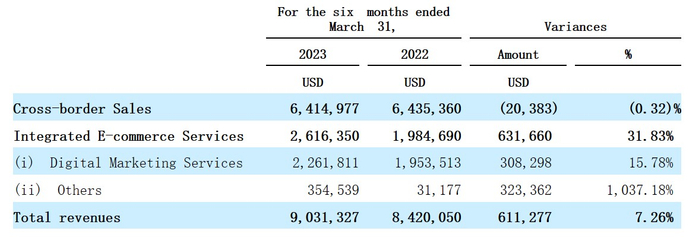 但进入2023财年上半年,传丞数字的总收入增速已下滑至7.26%,这主要是因为公司核心业务跨境销售的收入下滑0.32%所拖累,而综合电子商务服务则保持快速成长,期内收入增长31.83%。