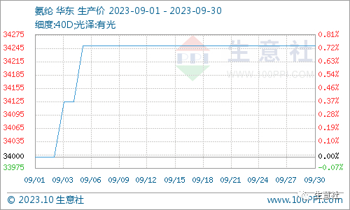 9月国内氨纶市场行情于月初小幅上行后,价格维稳运行,截止9月底40D氨纶价格为34250元/吨,较月初上涨0.74%。行业整体开工72%附近。成本端支撑有所松动,整体跟进气氛不佳,市场缓慢交投。“金九”之下纺织市场较七八月份有一定程度好转,江浙织机综合开机率略提升至65%以上,但低于去年同期,消费终端信心恢复仍需要一个比较长的过程。下游需求提振不太明显,订单仍以短单、小单为主流,预计10月氨纶价格将稳中偏弱调整。