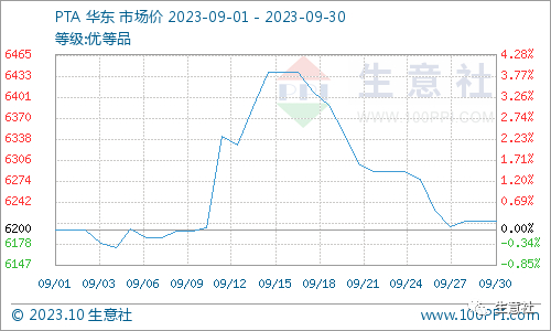 9月国内PTA价格先涨后跌,截至9月底,PTA华东地区现货市场均价为6213元/吨,较月初上涨0.22%。上半月,成本端支撑强劲,其中辅料醋酸价格大涨,叠加PTA装置意外降负,市场供应阶段收紧。此外“金九银十”需求旺季来临,终端织机开机率回升,利好因素叠加之下,PTA价格持续走强。但中下旬随着成本及需求端走弱,且自身装置重启,PTA价格震荡回落至月初水平。原油供应仍偏紧,高位支撑仍存,但近期下游聚酯因亚运、国庆假期计划减停工厂增多,终端无实际好转,库存累积,因此对PTA价格形成拖累。从整个后市来看,PTA新产能存在投产计划,供应增加,库存有上升预期,且下游需求旺季逐渐进入尾声,需求端也将回落。综合来看,成本支撑仍存但供强需弱,预计10月份PTA价格整体偏弱运行。