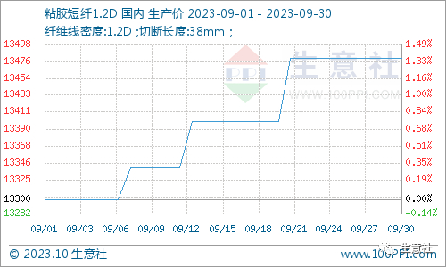 9月粘胶短纤整体价格重心延续上移,截止9月底,1.2D*38mm粘胶短纤国内地区出厂报价为13480元/吨,较月初上涨1.35%。受原辅料价格上涨、库存偏低、发货紧张等因素影响,特别是烧碱及化工原料成本走高,对粘胶短纤价格有较强支撑及推动作用。目前粘胶短纤行业库存处于中低位,原料溶解浆及辅料烧碱价格维持强势,对粘胶短纤利好支撑犹存。纺织市场正处传统旺季,但下游需求相对平平,改善并不明显,终端纺企心态也相对谨慎。预计短期内粘胶短纤市场整体将偏强整理运行,价格小幅提升为主。