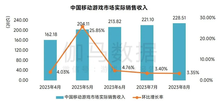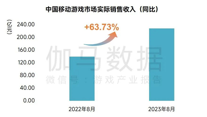 2023年8月,中国移动游戏市场实际销售收入为228.51亿元,环比上升3.35%,同比上升63.73%。本月主要增长原因如下:8月仍处于暑期,并包含七夕节日,相关活动再次刺激用户付费;此外,本月新品《冒险岛:枫之传说》流水达5亿元,同时上月新品《晶核》本月流水取得明显环比增长。
