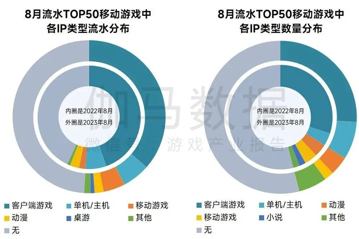 2023年8月,流水TOP50移动游戏中客户端游戏IP改编产品《和平精英》《梦幻西游》同比流水下滑明显,同时客户端游戏IP改编产品数量同比减少2款。