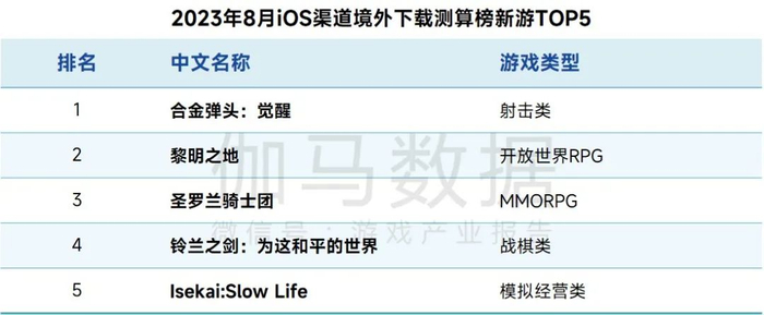 2023年8月,iOS渠道境外下载测算榜新游TOP5中有2款角色扮演类产品,分别为开放世界RPG类产品《黎明之地》、MMORPG产品《圣罗兰骑士团》。