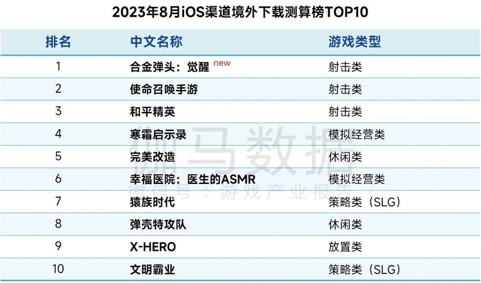 2023年8月iOS渠道境外下载测算榜TOP10中,新游《合金弹头:觉醒》登顶,榜单中TOP3均为射击类游戏。
