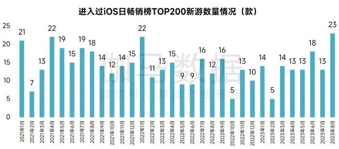 2023年8月,进入过iOS日畅销榜TOP200的新游数量为23款,为2021年至今入榜产品数量最多的月份,这表明企业在本年暑期档时间的产品投放意愿较大。