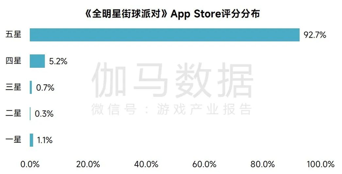 统计日期内,《全明星街球派对》在App Store共有超7万条评论,其中5星好评率达92.7%。正面评论中,用户认为该游戏在同类篮球游戏中整体表现较佳,角色设计较好地还原了人物真实的相关细节;负面评论中,部分用户表示游戏的匹配机制不够合理导致游戏体验不佳,希望官方能进行有针对性的改进。