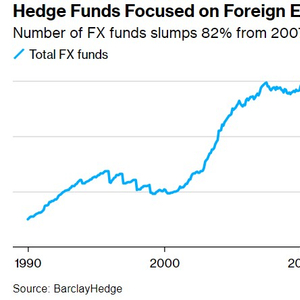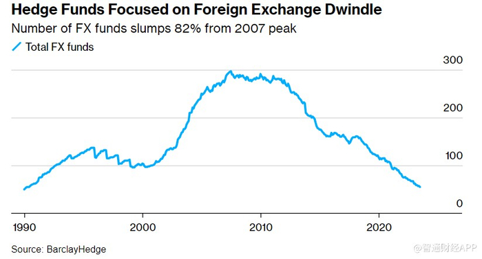 另一个推动因素是汇率波动性的下降。在超低利率和量化宽松时期,对市场至关重要的汇率波动性减弱了,许多投资者干脆退出了市场。专注于外汇交易的对冲基金数量已较2007年的历史高点减少了82%。