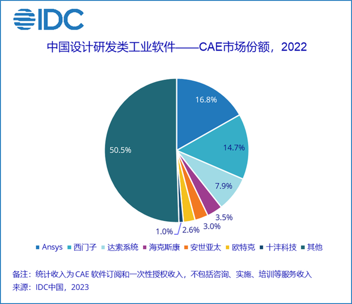 近几年本土厂商在各类设计研发类工业软件上都开始有所突破。报告数据显示,2022年本土厂商在CAD市场仍保持接近20%的市场占有率,CAE市场该数字则仍保持在15%左右。IDC预测,未来整体市场持续上涨的同时,该比例会持续提升。