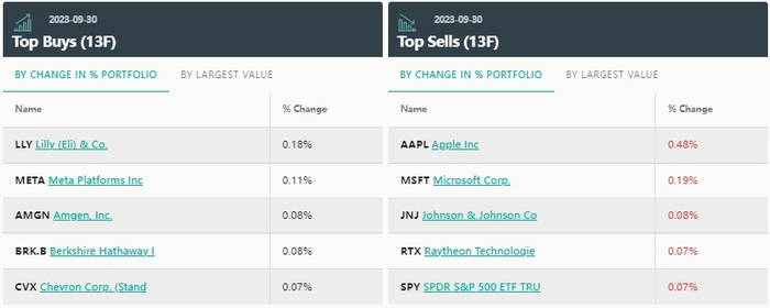 从持仓比例变化来看,前五大买入标的分别是:礼来(LLY.US)、Meta Platforms、安进(AMGN.US)、伯克希尔哈撒韦-B以及雪佛龙(CVX.US)。