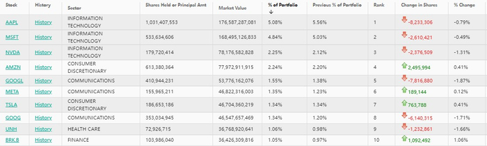 英伟达(NVDA.US)位列第三,持仓约1.80亿股,持仓市值约782亿美元,占投资组合比例为2.25%,较上季度持仓数量减少1.31%。