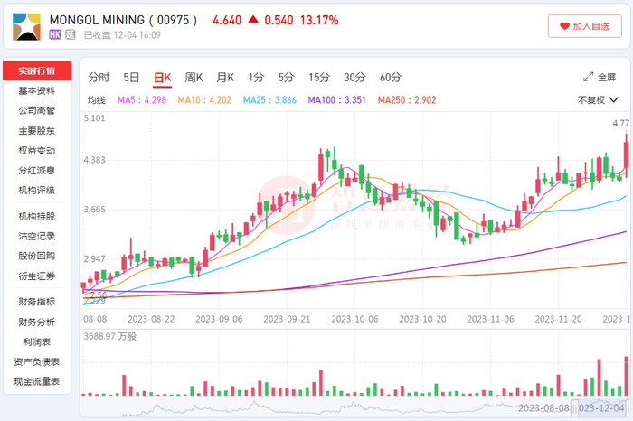 12月4日,蒙古焦煤强势拉升,盘中一度涨超16%,截至收盘大涨13.17%,领涨整个煤炭板块。自11月以来,伴随着整个煤炭板块的反弹行情,该股价累计上涨近45%。目前其股价报于4.64港元,总市值为48.37亿港元。