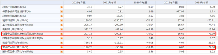 据相关数据披露,2018年至2022年,该公司营收同比增长率分别为24%、6.08%、-33.8%、-55.90%、196.76%;归母净利润同比增长率分别为-73.39%、16.62%、-70.02%、-290.87%、207.13%。