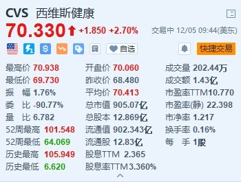 美国医药零售商CVS Health(CVS.US)涨2.7%,报70.33美元。CVS Health重申2023年业绩指引,预计2023年全年营收将达到3515亿至3573亿美元,调整后的每股收益8.50至8.70美元。CVS健康还预计,2024年全年营收为3660亿美元,市场预期为3454亿美元;预计调整后的每股收益为8.50美元,市场预期为8.52美元。该公司将2024年2月1日派发的股息提高约10%,至每股0.665美分。