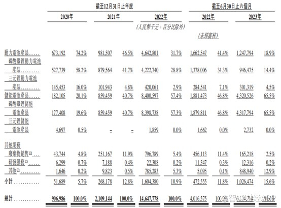 其中,储能电池产品占营业收入的比重连续增长,2020年至2022年分别为20.1%、40.7%、57.4%;动力电池产品的占比则在报告期内有所下降,分别为74.2%、46.5%、31.7%。截至2023年前6个月,动力电池产品收入达到12.48亿元,占比约为18.9%,储能电池产品收入约为43.21亿元,占比则为65.5%。