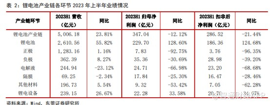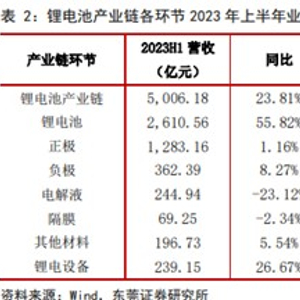 从产业链来看,电池环节上半年业绩表现最好,盈利能力维持相对高位。据东莞证券报告,2023年上半年锂电池环节总营收约为2610.56亿元,同比增速达到55.82%。