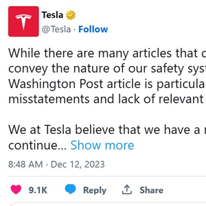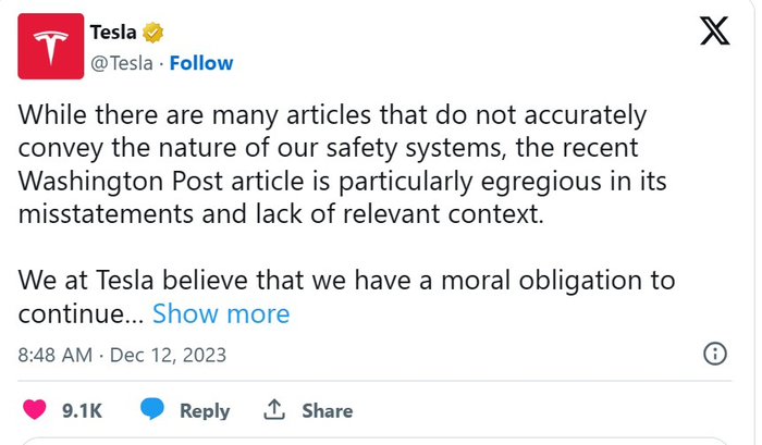 特斯拉在社交媒体平台X上(原推特社交平台)发表的一篇文章中表示,媒体的相关报道“利用司机错误地滥用Autopilot自动驾驶辅助功能的例子,表明该系统是所有问题所在”,并补充表示,Autopilot的安全性指数约为美国平均水平的10倍,比未启用该技术的特斯拉车型安全5倍。特斯拉方面多次重申,哪怕有Autopilot辅助,驾驶者在任何时候都有责任控制车辆,并被反复告知这一责任。