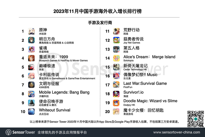 首次入围增长榜的手游还有Solotopia《Alice's Dream:Merge Island》、Cedar Technology HK《新倚天屠龙记》、FirstFun《Last War:Survival Game》、Dodjoy HK《Doodle Magic: Wizard vs Slime》和青瓷游戏《魔卡少女樱:回忆钥匙》。