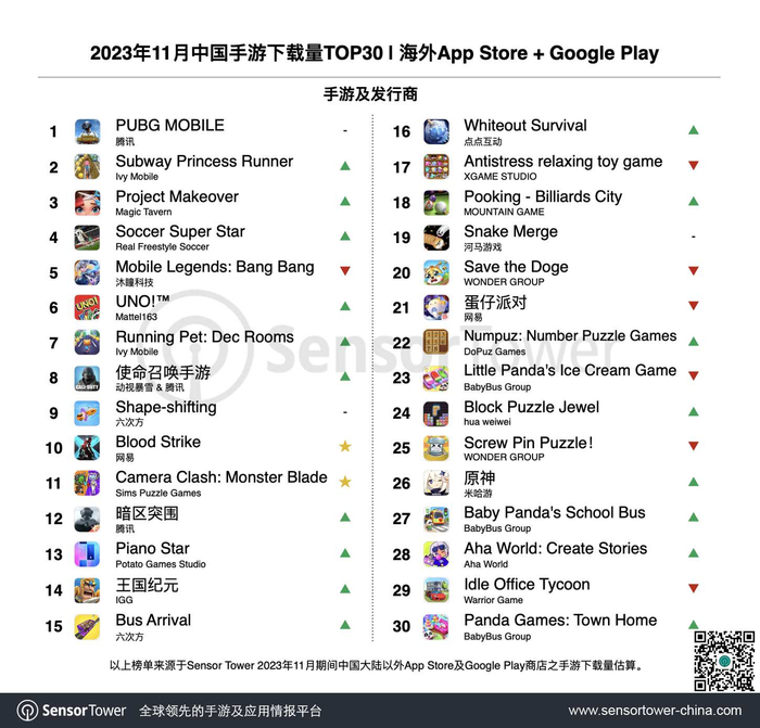 网易推出的战术竞技新游《Blood Strike》于9-10月陆续登陆拉丁美洲和东南亚市场,11月海外下载量环比上涨90%,首次入围下载榜第10名。