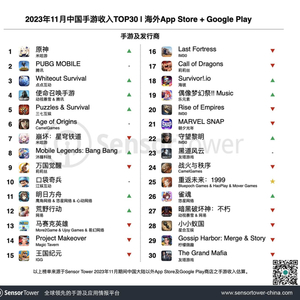 点点互动旗下冰雪末日题材手游《Whiteout Survival》本月海外收入和下载量再创新高,11月收入环比提升5%,下载量增长16%,升至收入榜第3名和下载榜第16名。自2023年2月上市以来,《Whiteout Survival》连续9个月保持收入上涨趋势,在全球策略手游收入收紧的市场中逆流而上。