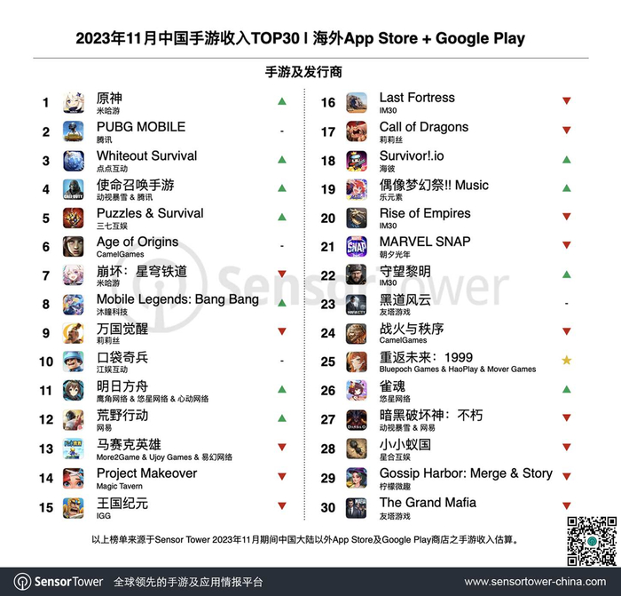 11月,深蓝互动复古神秘学题材回合制RPG手游《重返未来:1999》在日本、韩国和美国等多个市场收入增长突出,本月海外收入环比提升151%,首次入围收入榜第25名,跻身增长榜第4名。