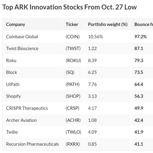 ARK Innovation ETF从低谷中走出的另一个大赢家是Twist Bioscience,尽管它对投资组合的重要性远不及Coinbase。该公司参与了基于DNA的药物革命,今年股价飙升了87%。不过,它在ARK Innovation ETF投资组合中的比重仅为1.2%。与此同时,流媒体视频服务商Roku继续赢得伍德的赞誉。该公司的股价较10月份的低点上涨了79%。今年已经上涨了148%。它在ARK Innovation ETF的投资组合中占8.4%的份额,因此在反弹到顶部的过程中,它绝对是一个重要的角色。