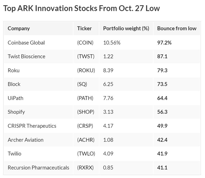 智通财经获悉,“木头姐”凯西•伍德(Cathie Wood)旗下ARK Innovation ETF今年的表现再次跑赢,超过了富达蓝筹股增长ETF (FBCG)和标普500指数。她在很大程度上要感谢一个巨大的投机性股票选择。对标普全球市场情报和MarketSmith数据的分析显示,ARK Innovation ETF的四只股票,包括Coinbase(COIN.US)、Twist Bioscience(TWST.US)、Roku(ROKU.US)和Block(SQ.US),从10月27日的今年低点上涨了70%以上。