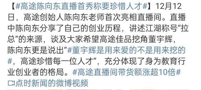 恰好,高途教育的创始人、“拉总”陈向东也其中之一。他还是新东方的前高层,深谙老东家的企业文化和管理技巧。他在直播中表示:“如果董宇辉愿意来到高途,我们将非常高兴地欢迎他。”