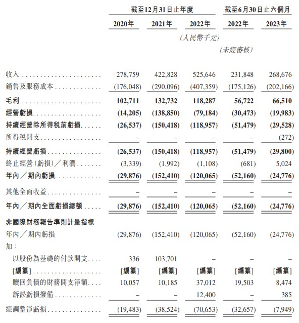 财务方面,于2020年度、2021年度、2022年度以及2023年6月30日止,公司实现收入分别为2.79亿元、4.23亿元、5.26亿元、2.69亿元,同期,公司年内/期内分别亏损0.3亿元、1.52亿元、1.2亿元、0.25亿元。