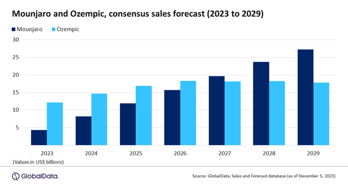 诺和诺德(NVO.US)的司美格鲁肽(商品名Wegovy)在2023年掀起了减肥行业的风暴,使该药物成为最耀眼的明星产品。然而,礼来公司(LLY.US)的替尔泊肽(tirzepatide)成了潜在的挑战者。数据和分析公司GlobalData认为,强大的减肥疗效临床数据将让替尔泊肽超过司美格鲁肽,成为肥胖和糖尿病市场最畅销的药物,预计2029年销售额将会达到270亿美元。