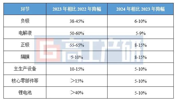 2024年锂电池产业链主要环节产品价格在2023年基础上降价幅度在5~15%。其中负极、电解液等环节降幅5~12%,正极、隔膜等降幅8~15%。除材料外,2024年锂电生产设备及相关零部件的价格也将在2023年的基础上继续下降。