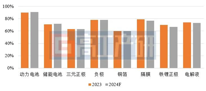 在材料方面,2024年中国锂电铜箔、负极及三元正极市场CR6集中度将与2023年持平(2023年分别为60%、78%、53%)。隔膜、铁锂正极及电解液CR6集中度将在2023年基础上(2023年分别为77%、67%、73%)再下降2-4个百分点。
