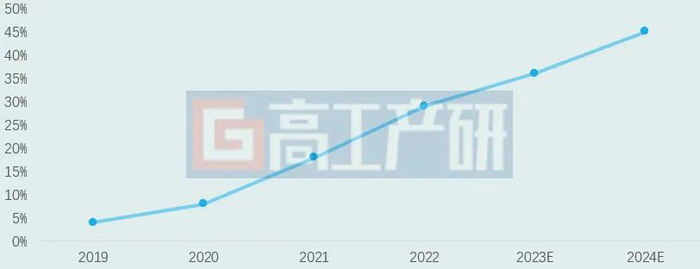2019-2024年中国市场乘用车 L2(含 L2+)搭载率及预测
