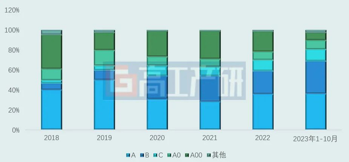 近几年,我国新能源乘用车高端化趋势明显。2023年1-10月,新能源乘用车B级及以上车型占比达到46.4%,2022年则为35.2%。随着电池价格下降,B级及以上车型产品价格的同步下降,再加上更多具有竞争力B级及以上车型产品的推出,预计2024年我国B级及以上车型销量占比有望达到50%。