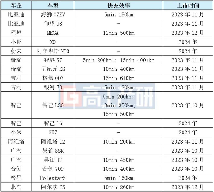 部分已发布及待发布的支持800V高压快充车型